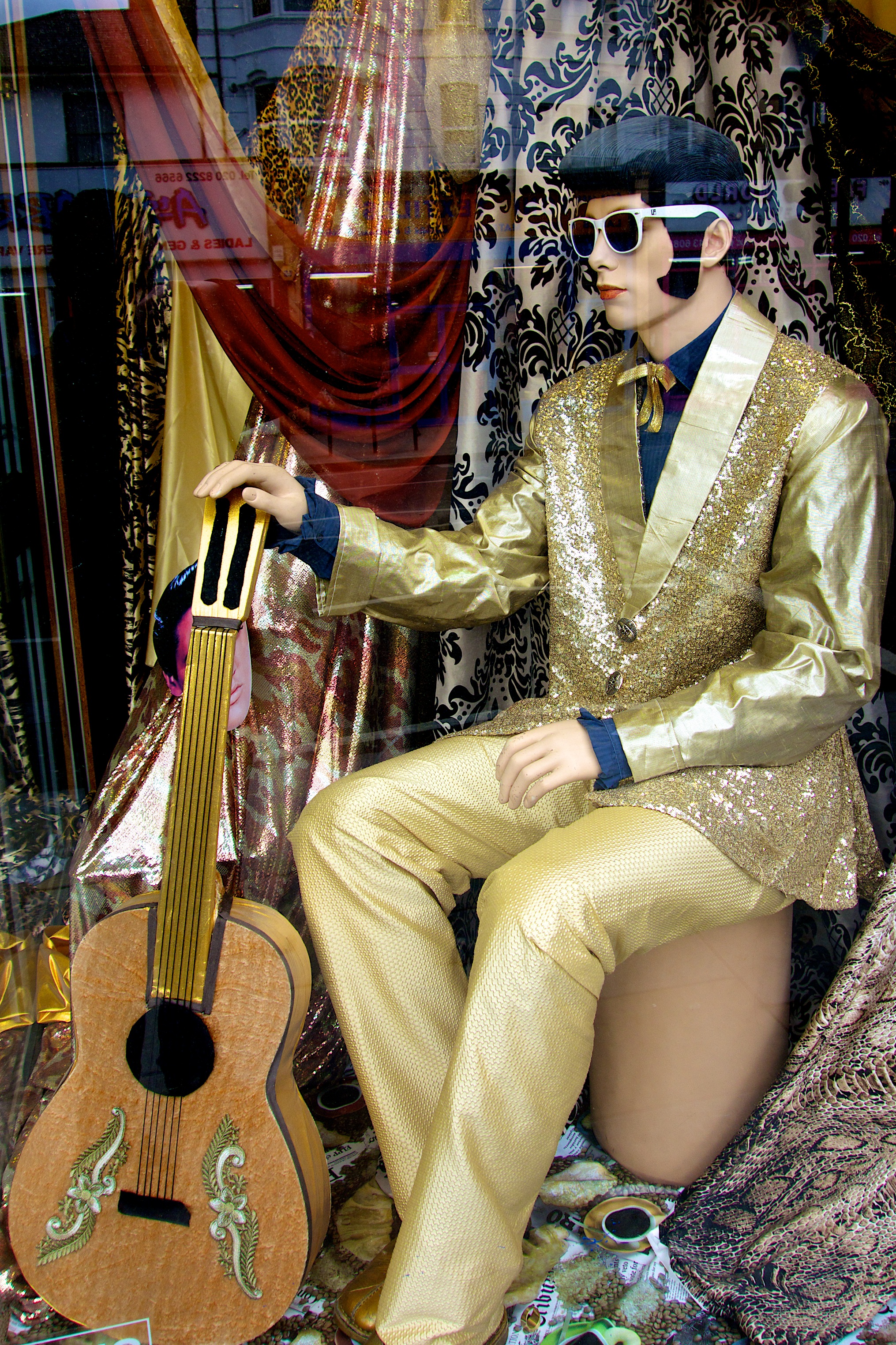 A random fabric shop on Goldhawk Road has this window display featuring a home-made Elvis. I can’t decide whether they want to show off their lovely golden fabrics, or demonstrate their ability to make a guitar from cardboard. Either way, well done on the sunglasses.